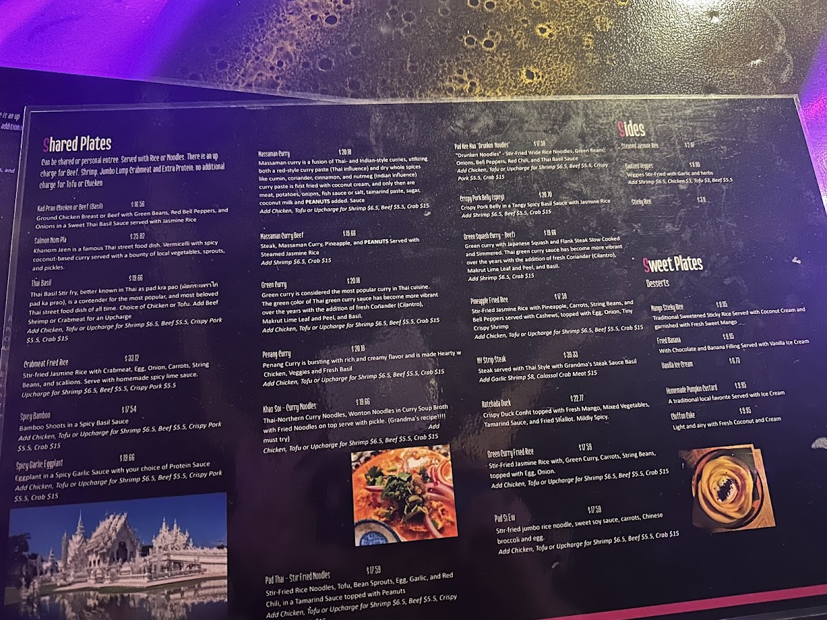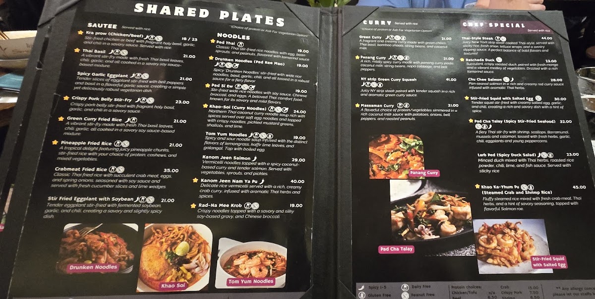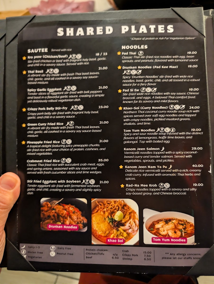 The shared plates section presents heartier entrees featuring proteins such as chicken, beef, or tofu cooked in traditional sauces like sweet Thai basil and spicy garlic. These dishes are generally served with jasmine rice and are suitable for a communal dining experience or a more substantial meal.