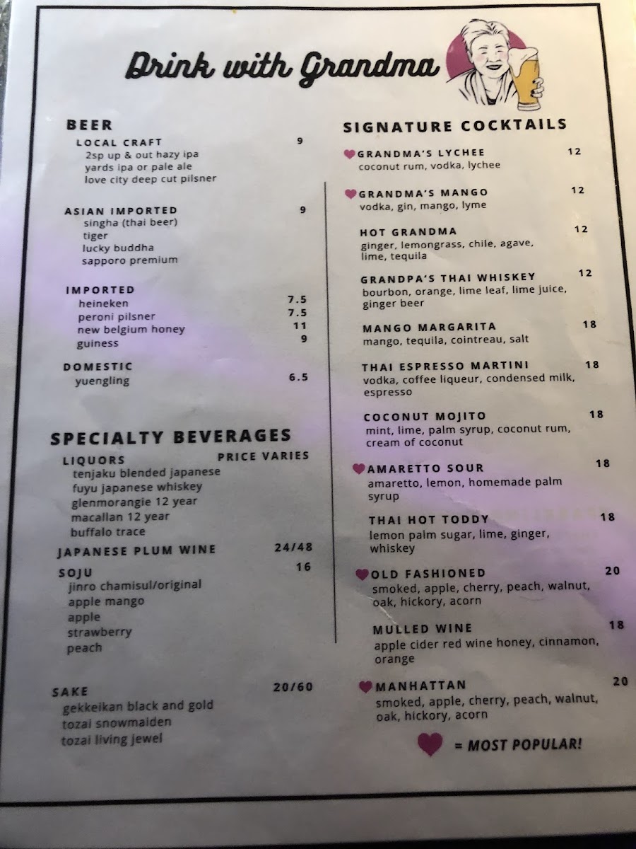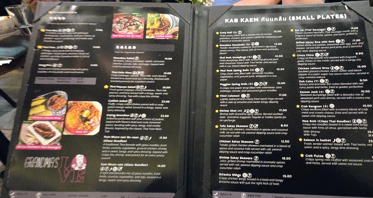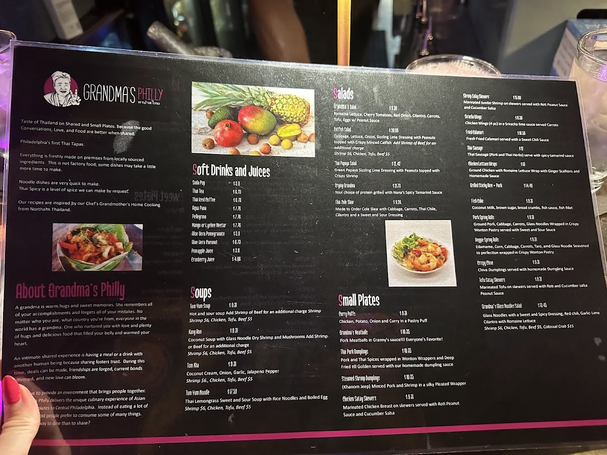 The menu at Grandma's Philly offers a diverse selection of traditional Thai dishes alongside a variety of small plates and bar-style offerings. Guests can expect a range of options including salads, shared plates, and light bites designed for casual dining and social sharing.